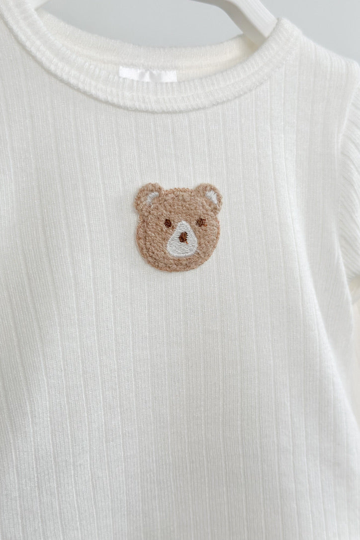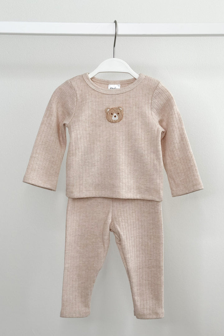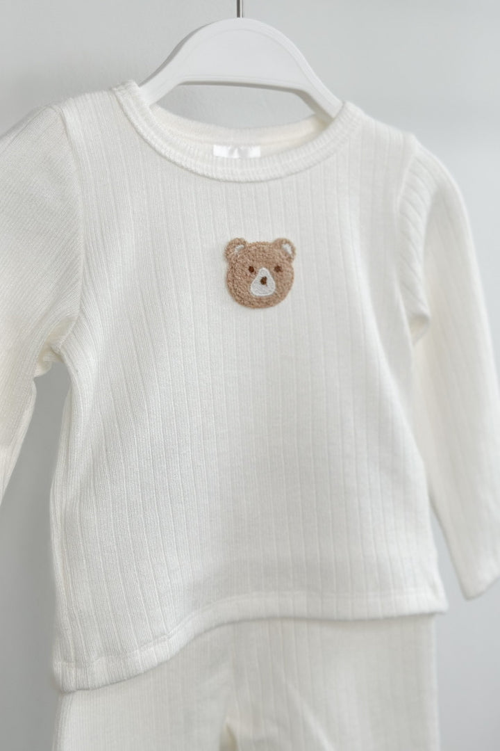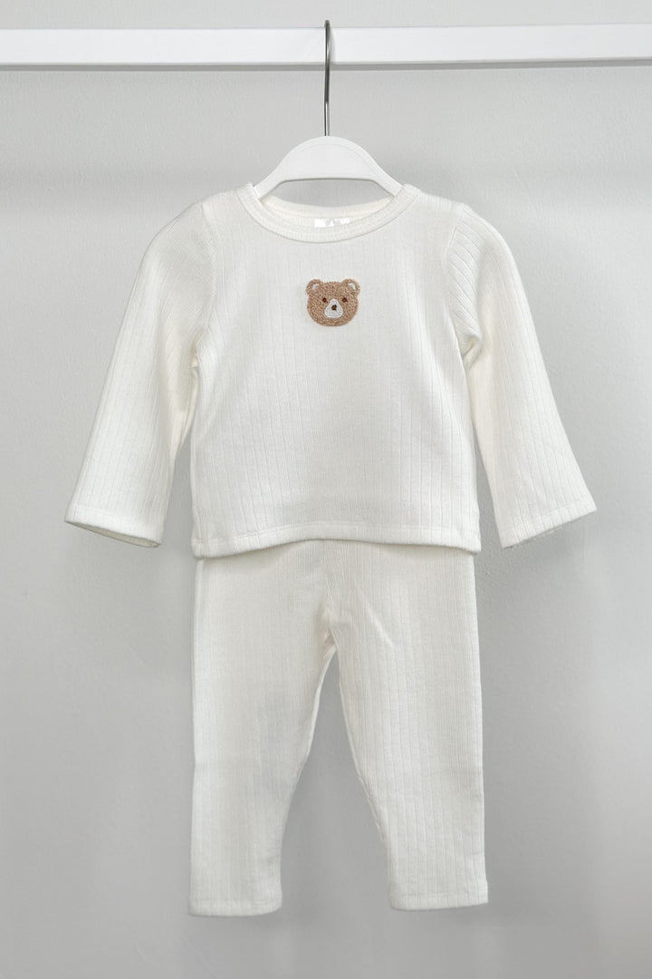 Unisex loungewear set from Polish brand Jamiks. Super soft, stretchy, lightweight ribbed top and leggings set, finished with an adorable 3D teddy bear head appliqué to the chest.