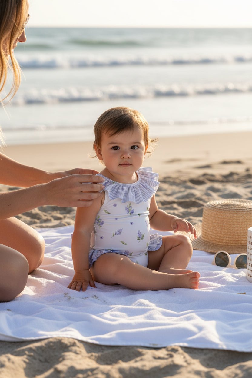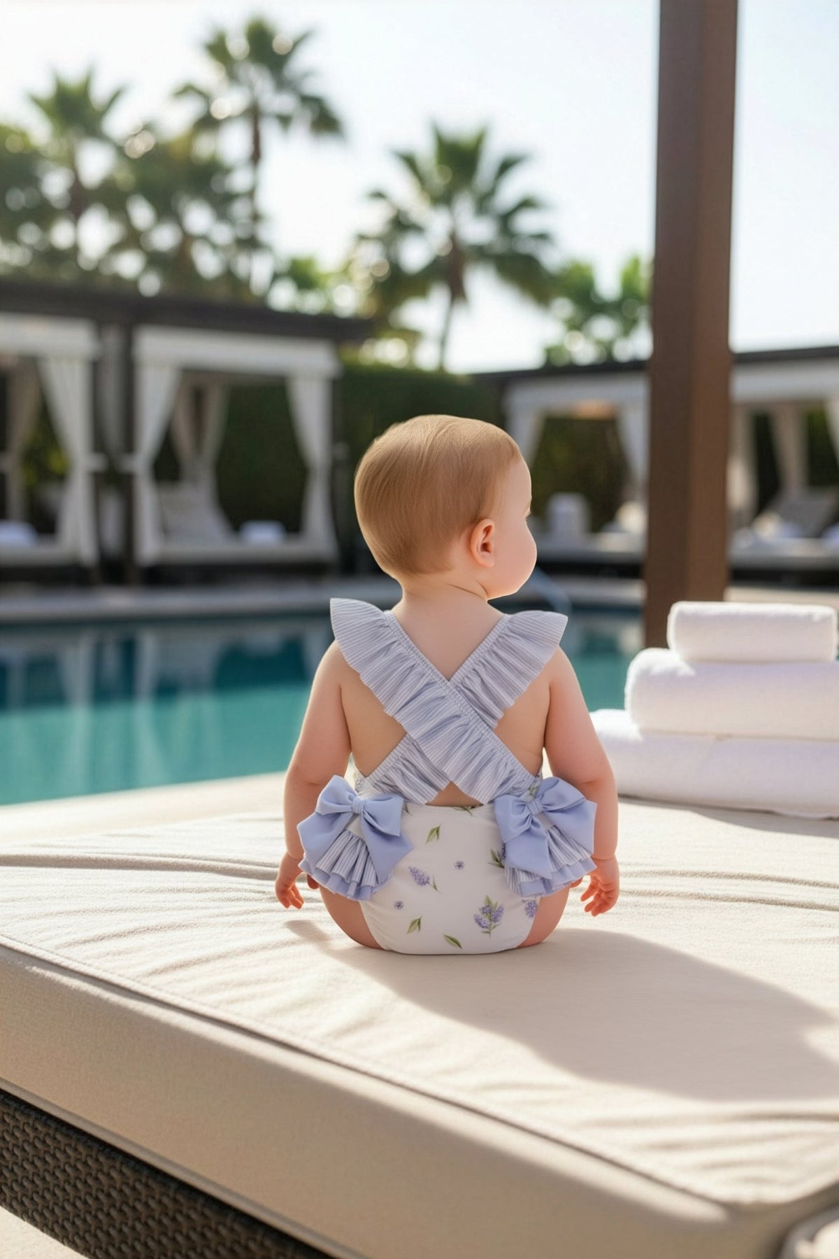 Fully lined for comfort, this style features a delicate lavender floral print, with ruffled trims at the shoulder straps and hips for a playful yet timeless silhouette. Stretchy cross-over straps ensure a secure, flexible fit, while the statement bow at the back adds a truly special finishing touch – perfect for beach days, holidays and family photos.