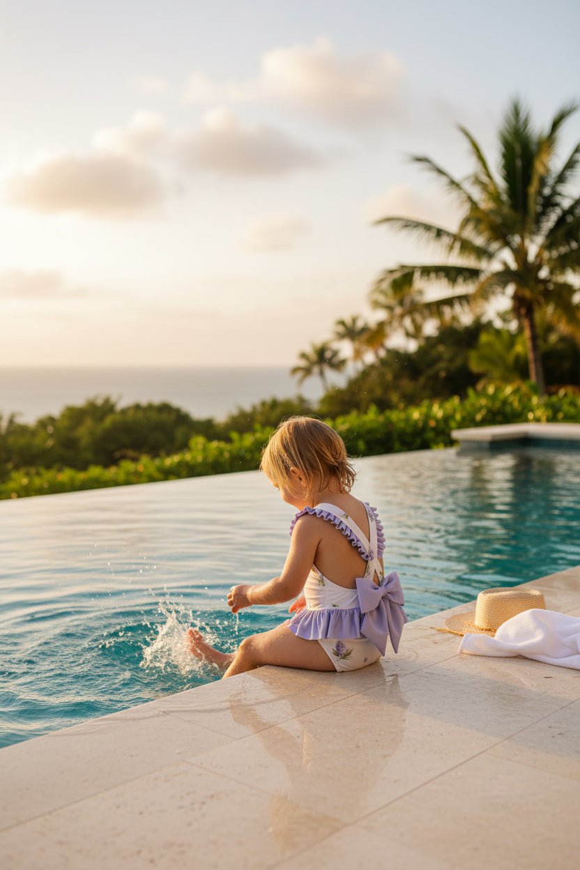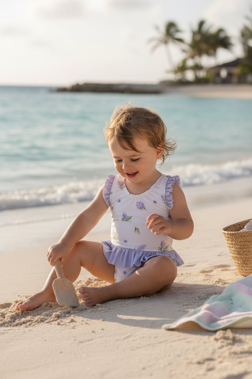 Soft, elegant and beautifully detailed, Meia Pata's Lavender print Saona swimsuit is a timeless choice for sunny days. Made from silky smooth recycled fabric with UPF 50+ sun protection, this fully lined one-piece offers comfort, coverage and peace of mind for parents.