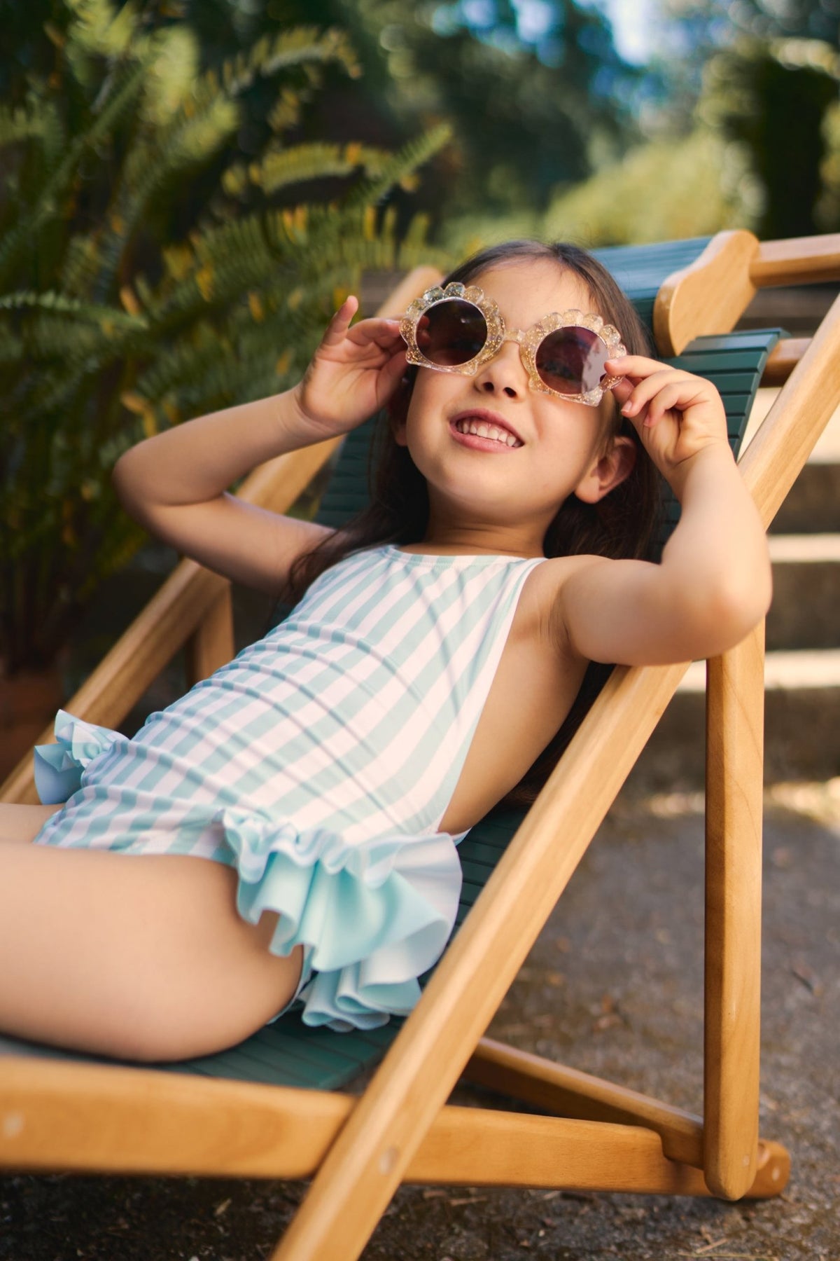 Soft, sweet and made for sun-filled days, the Meia Pata Bahamas swimsuit in the Mint Stripes print is a charming choice for little summer explorers. Featuring gentle mint and white stripes, it’s finished with pretty ruffle trims and a statement bow at the back for an extra-special touch.