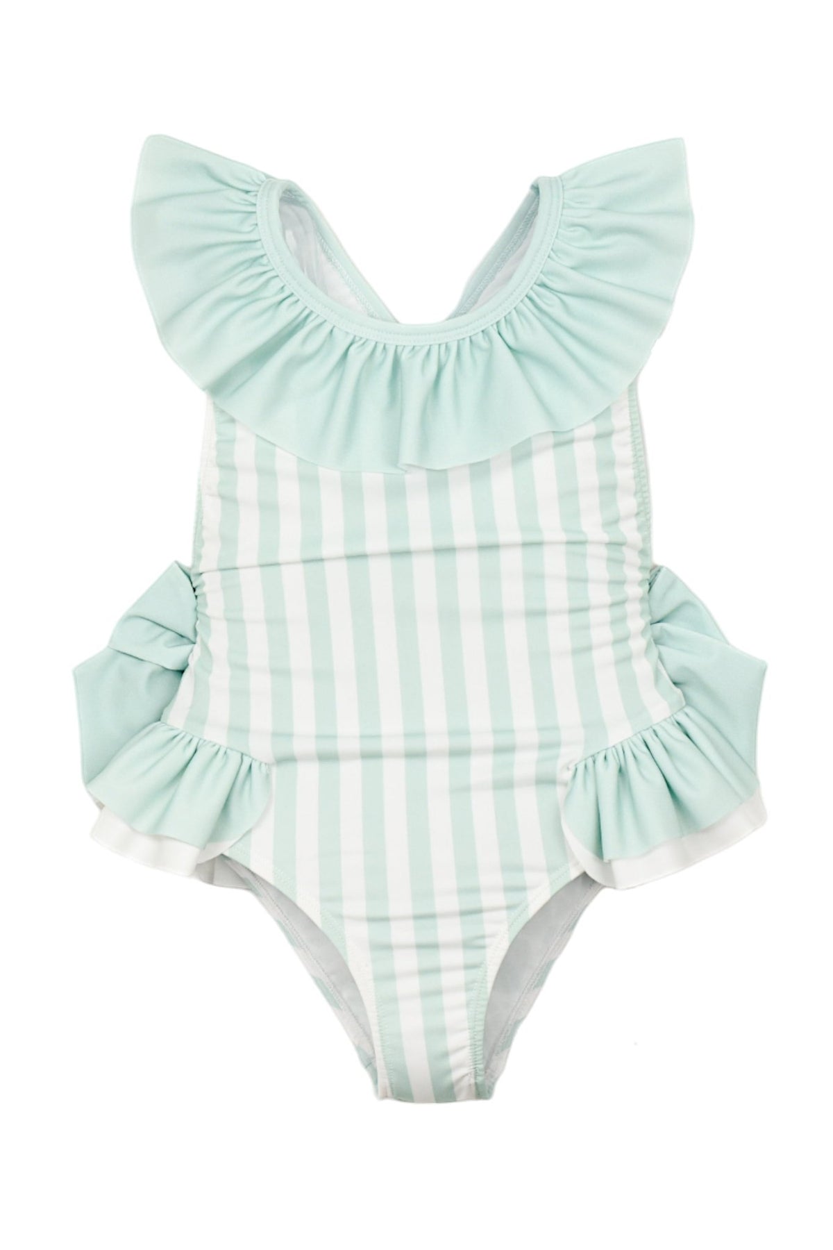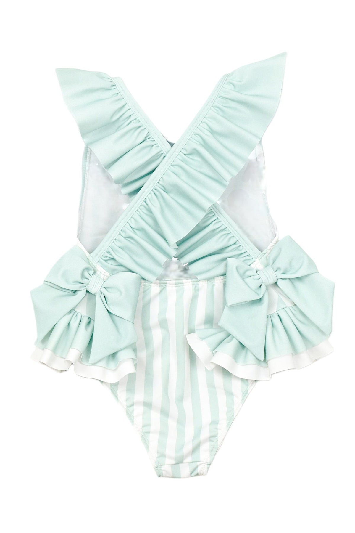 Soft, sweet and full of summer charm, the Meia Pata Barbados swimsuit in the Mint Stripes print is a beautiful choice for sunny days by the sea. Featuring fresh mint and white candy stripes, it’s finished with delicate ruffle trims and a statement bow at the back for an extra-special touch.