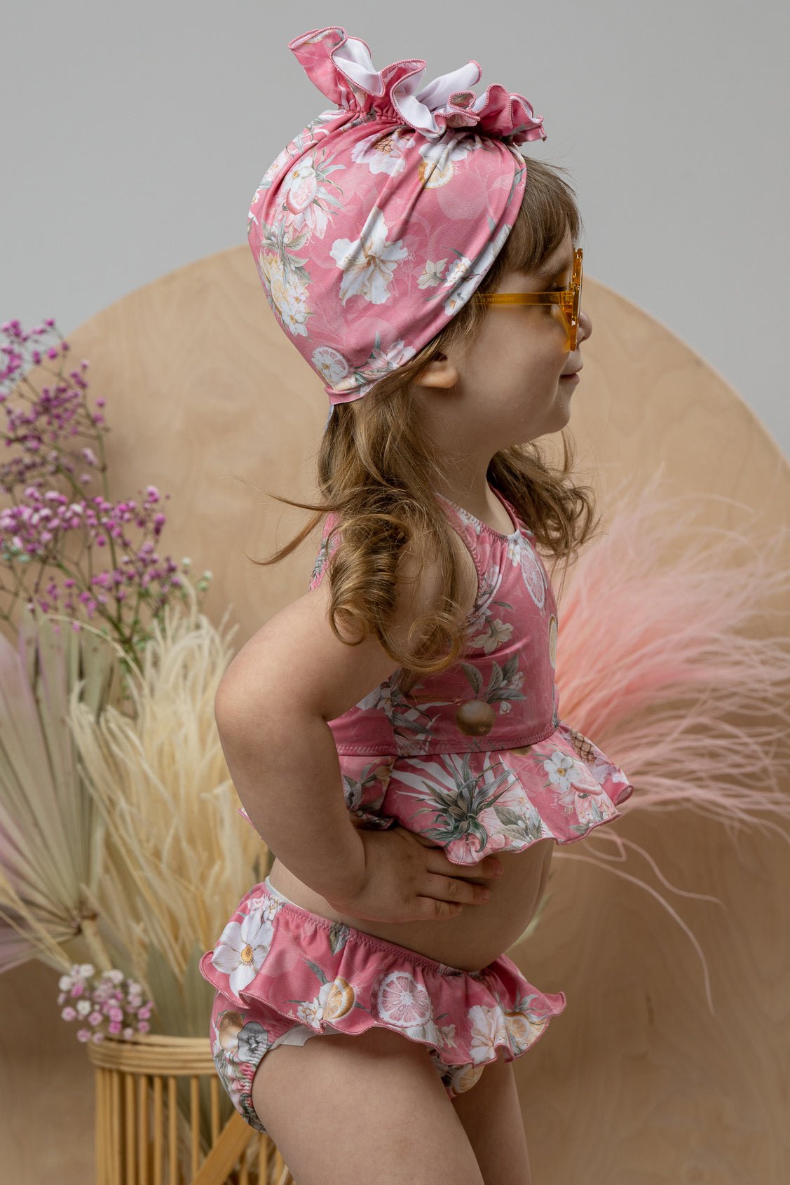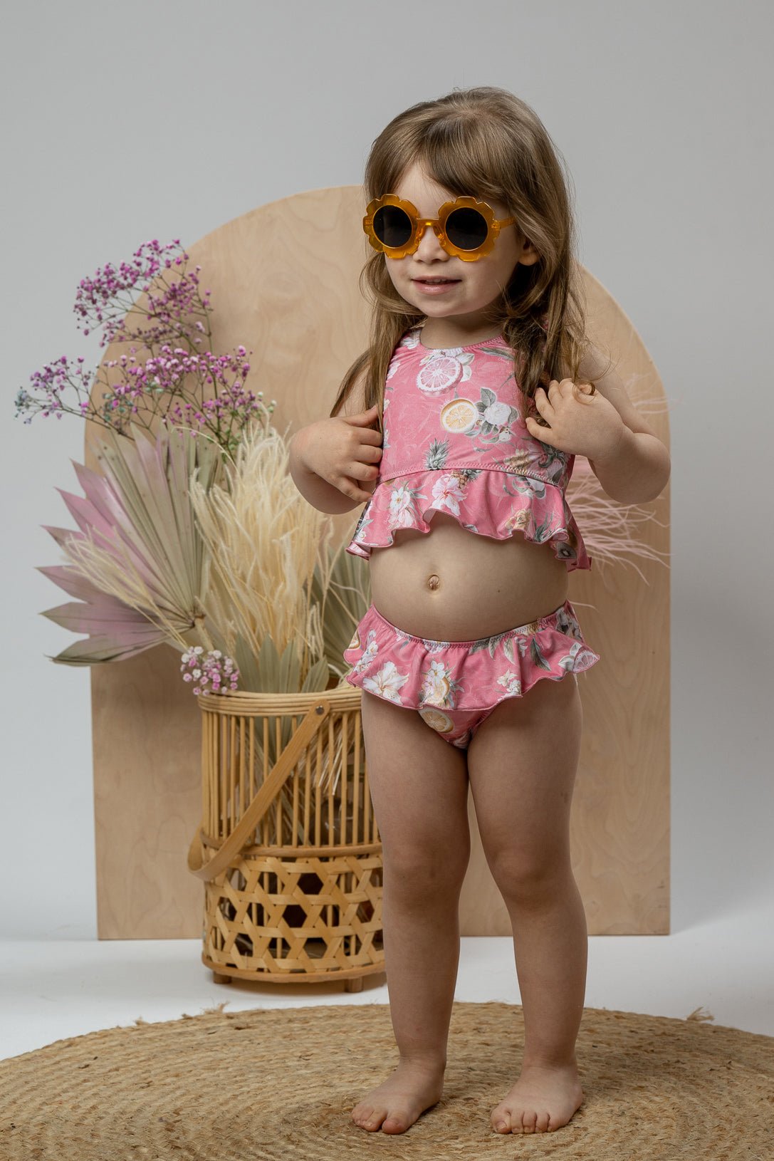 Girl's bikini from Polish brand Jamiks. Hot pink fruit and floral print bikini with frill to the top and bottoms, made from super soft silky SPF 50+ protected fabric.