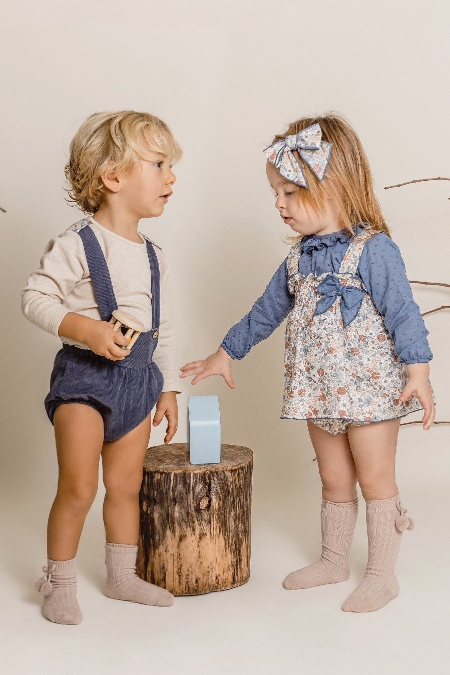 Baby boy's outfit set from Spanish brand Calamaro's Autumn/Winter '23 collection. Soft sand-coloured jersey cotton long sleeve top with dusky blue cord loops to shoulders to keep braces in place, paired with super soft dusky blue needlecord jam pants with braces.